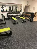 Podlahová guma (deska) FLOMA FitFlo SF1050 s příměsí 5+5% EPDM barevného granulátu v provedení 5% bílá + 5% modrá je ideální podlahou do domácích posiloven a fitness (profesionální fitness centra obvykle volí výšku 1,6 cm). Velice dobře absorbuje nárazy, pády při cvičení, zmírňují dopady činek a cvičícího nářadí. Nespornou výhodou materiálu je také šetrnost ke kloubnímu aparátu cvičence. Tato gumová podlahovina se dá použít jako celoplošná podlaha do domacích fitness, jako pochůzné plochy v posilovnách, jako podložky pod cvičící stroje, odkládací plochy pro činky a další.