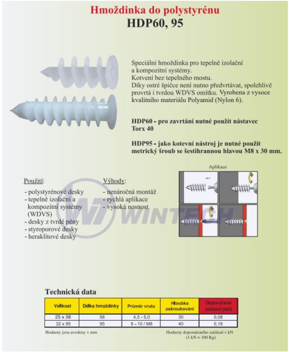 Speciální hmoždinka pro tepelně izolační. A kompozitní systémy. Kotvení bez tepelného mostu. Díky ostré špičce není nutno předvrtávat, spolehlivě. Provrtá i tvrdou WDVS omítku. Vyrobeno z vysoce. Kvalitního nylonu.