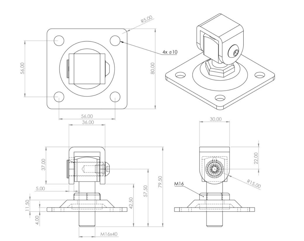 Závěs nastavitelný s plotnou 80 x 80 mm, závit M16, pozinkovaný